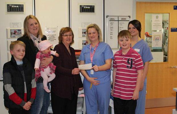 Photograph is of Claire Moore, her children Jacob, Isaac and Jenna-Anne and Mary Rae presenting the cheque to nurses Stacey Dixon and Jodie McPherson on NICU ward.