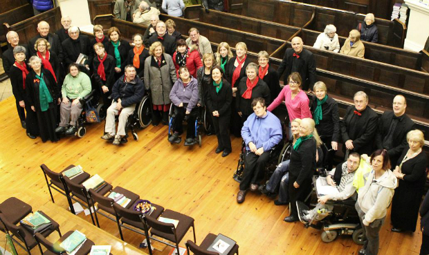 Photograph was taken after the concert and shows Lady Walpole, the Octagon Singers and those residents of John Grooms Court who attended the concert.